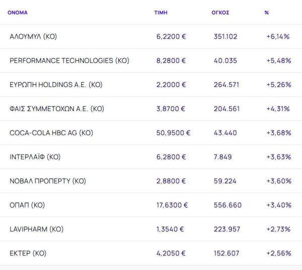 Οι μετοχές με τη μεγαλύτερη άνοδο ήταν: