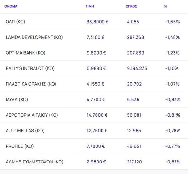 Οι μετοχές με τη μεγαλύτερη πτώση ήταν: