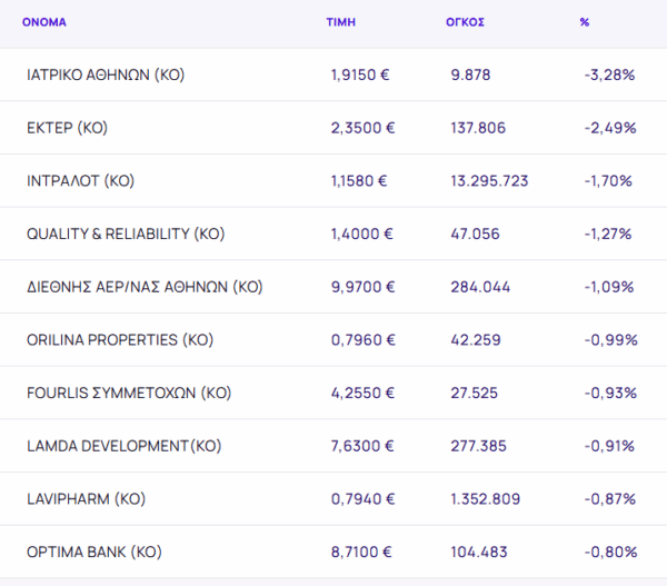 Οι μετοχές με τη μεγαλύτερη πτώση ήταν: