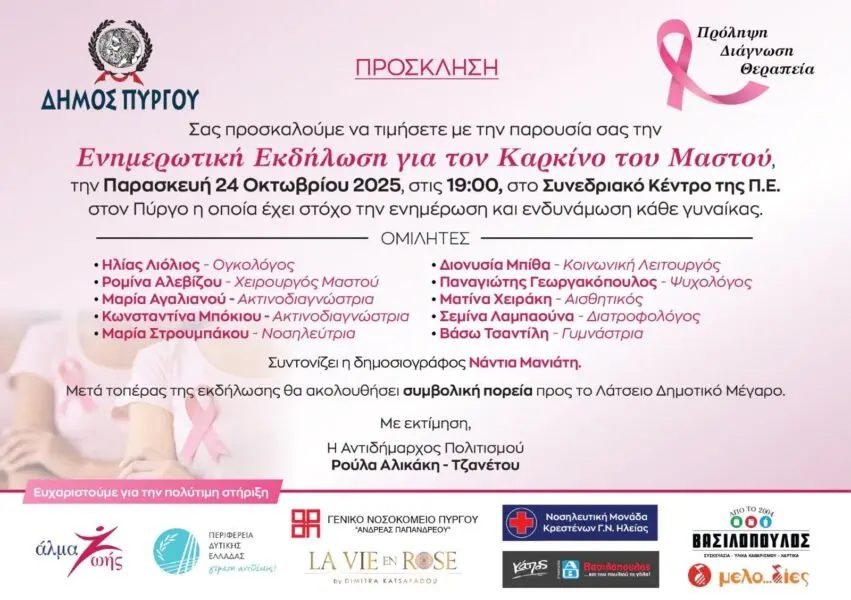 Δήμος Πύργου: Ενημερωτική Εκδήλωση για τον Καρκίνο του Μαστού την Παρασκευή 24 Οκτωβρίου, στο Συνεδριακό Κέντρο της Π.Ε. Ηλείας