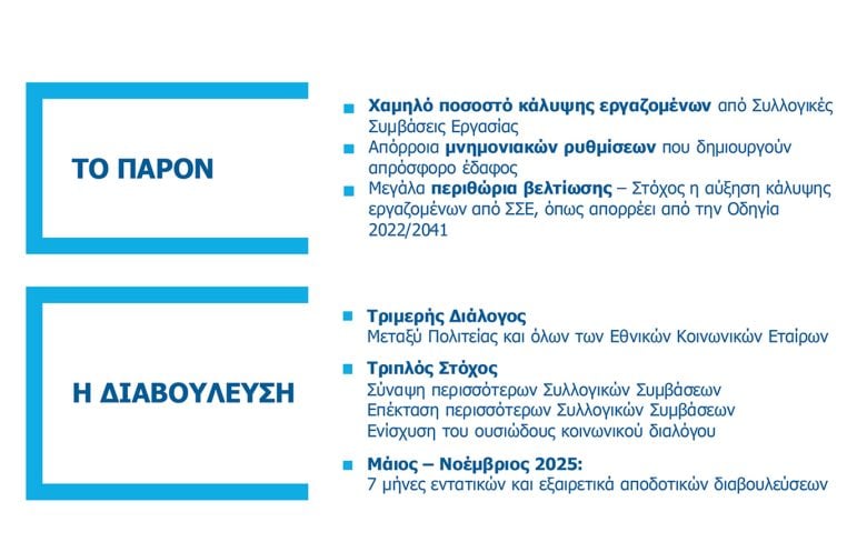Η έκδοση του σχεδίου δράσης για την ενίσχυση των Συλλογικών Συμβάσεων Εργασίας θα πραγματοποιηθεί εντός του Δεκεμβρίου, ενώ η κοινωνική συμφωνία θα νομοθετηθεί στις αρχές του 2026.