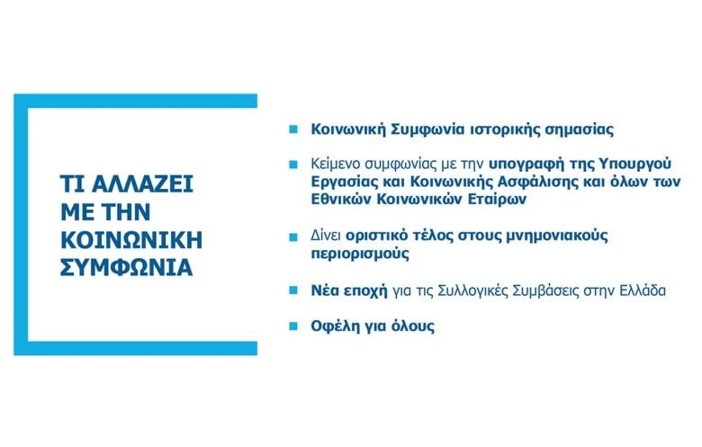 Όπως αναφέρθηκε, η κοινωνική συμφωνία συνεπάγεται πολλαπλά οφέλη για εργαζόμενους και επιχειρήσεις, καθώς οδηγεί στη σύναψη και επέκταση περισσότερων Συλλογικών Συμβάσεων Εργασίας, δημιουργεί ένα ασφαλές και προβλέψιμο εργασιακό περιβάλλον, προστατεύει πλήρως τα δικαιώματα των εργαζομένων ακόμα και μετά τη λήξη Συλλογικής Σύμβασης Εργασίας, προστατεύει τους νεοπροσλαμβανόμενους, δημιουργεί τις προϋποθέσεις για περαιτέρω αύξηση μισθών και παροχών, ενισχύει τον υγιή ανταγωνισμό και διασφαλίζει τη νομιμότητα με σαφή προσδιορισμό του πεδίου εφαρμογής των Συλλογικών Συμβάσεων Εργασίας και κατά την επέκτασή τους.