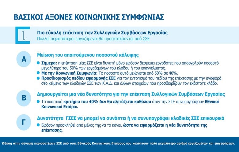 Ο πρώτος άξονας αφορά τη διευκόλυνση που παρέχεται στην επέκταση των Συλλογικών Συμβάσεων Εργασίας, ώστε πολλοί περισσότεροι εργαζόμενοι να προστατεύονται από Συλλογικές Συμβάσεις Εργασίας.