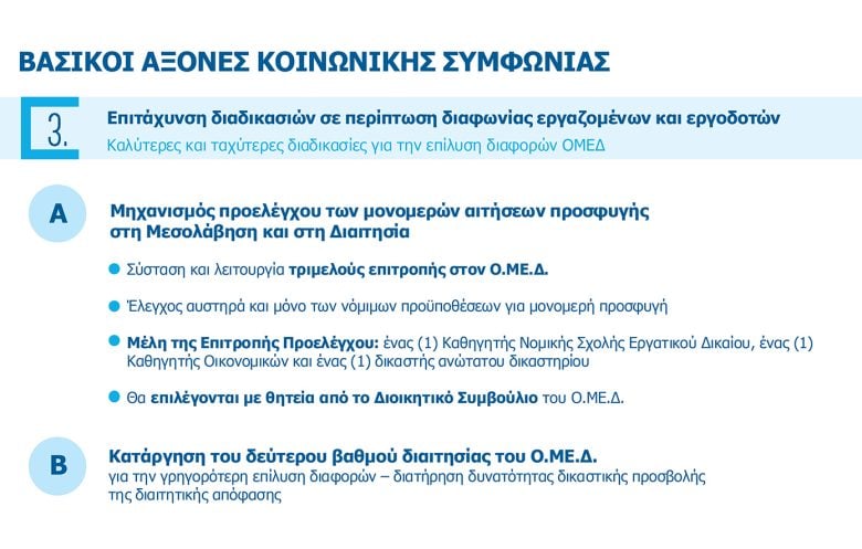 Ο τρίτος άξονας αφορά στην επιτάχυνση των διαδικασιών σε περίπτωση διαφωνίας εργαζομένων και εργοδοτών. Θεσπίζονται καλύτερες και ταχύτερες διαδικασίες για την επίλυση διαφορών μέσω του Ο.ΜΕ.Δ..Συγκεκριμένα, η κοινωνική συμφωνία προβλέπει μηχανισμό προελέγχου των προϋποθέσεων για μονομερή προσφυγή στη Μεσολάβηση και στη Διαιτησία από τριμελή επιτροπή που θα συσταθεί στον Ο.ΜΕ.Δ.. Επίσης, καταργείται ο δεύτερος βαθμός διαιτησίας του Ο.ΜΕ.Δ για τη γρηγορότερη επίλυση διαφορών, ενώ διατηρείται η δυνατότητα δικαστικής προσβολής της διαιτητικής απόφασης.
