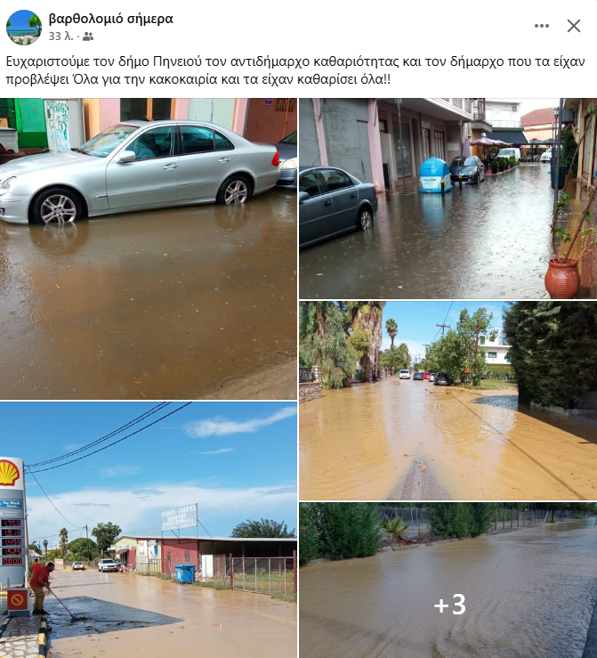 “Ευχαριστούμε θερμά τον Δήμο Πηνειού, τον αντιδήμαρχο καθαριότητας και φυσικά τον ίδιο τον δήμαρχο, που είχαν προβλέψει τα πάντα ενόψει της κακοκαιρίας. Όλα πεντακάθαρα, όλα προετοιμασμένα, τίποτα δεν άφησαν στην τύχη – γι’ αυτό και το Βαρθολομιό μετατράπηκε σε… μικρή Βενετία. Μπράβο για την προνοητικότητα και την έγκαιρη μέριμνα!”